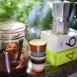 Need a strong boost? Enjoy a ristretto in style with a cup that is just the right size, but without the handle. Thanks to the earthy elements and natural colours, this is the most relaxed range in the retro 70s ceramic collection. The exciting colour compositions and textured, hand-finished surfaces make each piece unique.