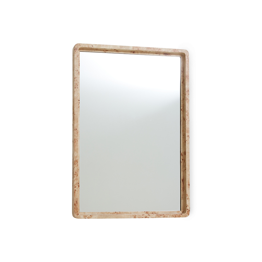 Bring a special object into your home with this wall mirror. The mirror is made of a special veneer of burl wood, which is highly prized for its beauty and rarity, making it a unique piece. You can place the mirror on top of a cabinet leaning against the wall or secure it to the wall by using the steel eyelets.