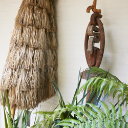 Tan oak, plastic raffia, metal parts, polyester fabric