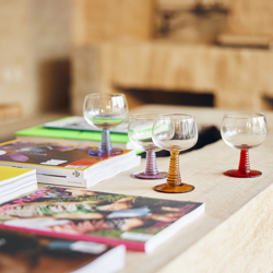 Hand-blown swirl wineglass with a solid ochre coloured glass base. Stands out immediately and gives the glass a playful look. This way you can enjoy your wine or another drink even more.