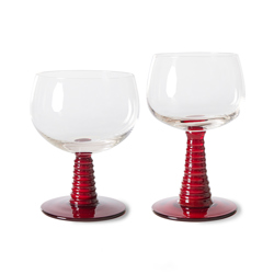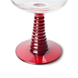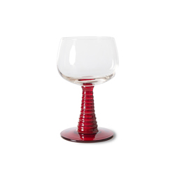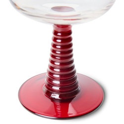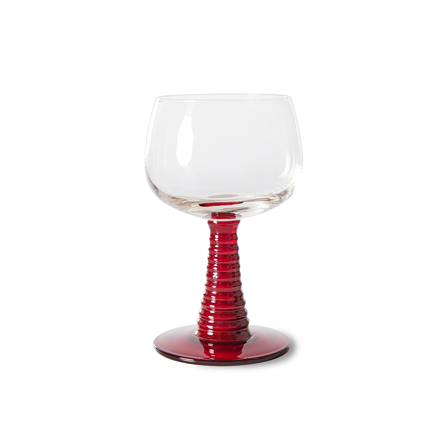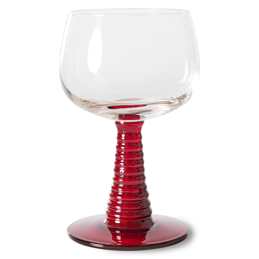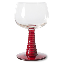 Hand-blown swirl wineglass with a solid red coloured glass base. Stands out immediately and gives the glass a playful look. This way you can enjoy your wine or another drink even more.