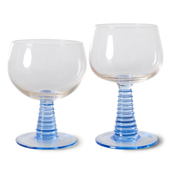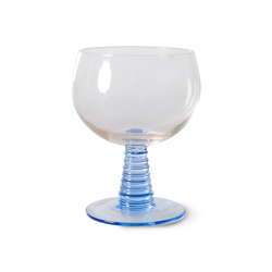 Hand-blown low swirl wineglass with a solid blue coloured glass base. Stands out immediately and gives the glass a playful look. This way you can enjoy your wine or another drink even more.